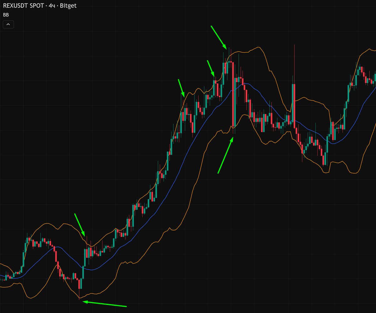 2) Важно: резкое расхождение в разные стороны границ индикатора значительно усиливает его сигналы. Это обозначает, что у монеты повышаются объёмы, повышается волатильность и зарождается тренд (локальный либо глобальный). Особенно сильный сигнал, если при этом появляется пробой одной из границ индикатора. Показано на графике ниже: