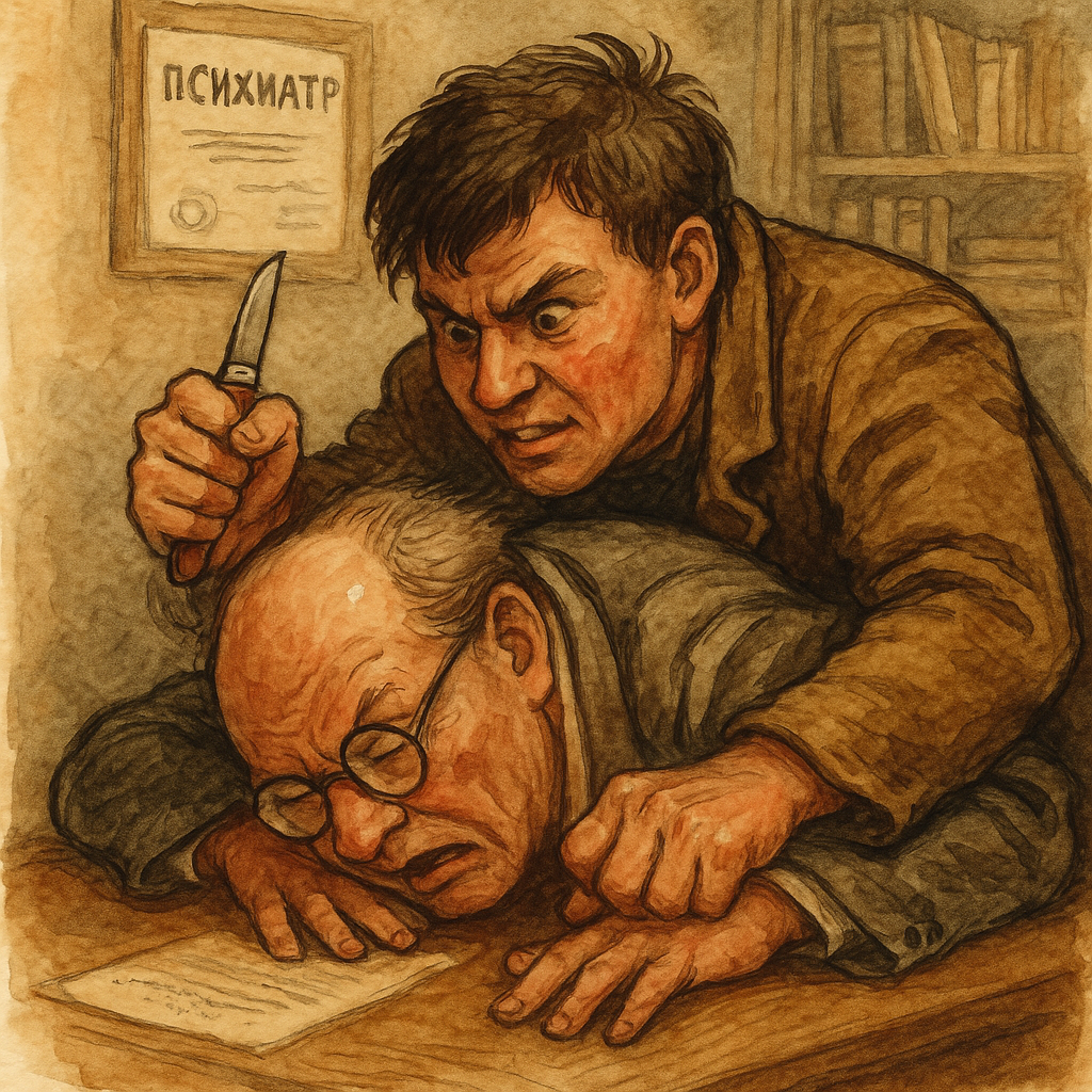 Глеб резко встал и с отрешенным выражением лица заломил доктору правую руку за спину, бросив лицом на письменный стол, зашипел словно змея:
