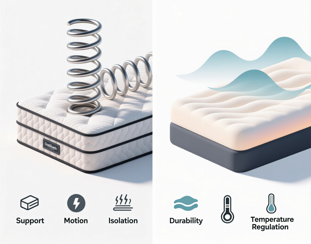 Сравним ортопедические пружинные и беспружинные матрасы по ключевым характеристикам: жёсткости, поддержке позвоночника, долговечности, уровню шума, совместимости с партнёром и другим параметрам. 🔹 1. Жёсткость 👉 Вывод: Беспружинные матрасы позволяют точнее подобрать нужную жёсткость за счёт комбинации слоёв. Пружинные — особенно с независимыми пружинами — тоже могут быть жёсткими, но их «ощущение» иное: больше пружинистости. 👉 Вывод: Оба типа могут быть ортопедическими, но беспружинные чаще обеспечивают более точную анатомическую поддержку, особенно при индивидуальных особенностях тела. 👉 Вывод: Высококачественные беспружинные (латекс, кокос) часто долговечнее, чем пружинные. 👉 Вывод: Беспружинные — тише и стабильнее в использовании. 👉 Вывод: Современные беспружинные и пружинные с независимыми блоками равноценны по этому параметру. 👉 Вывод: Пружинные — лучше вентилируются по умолчанию, но качественные беспружинные (особенно с натуральными наполнителями) тоже дышат хорошо. Хотите