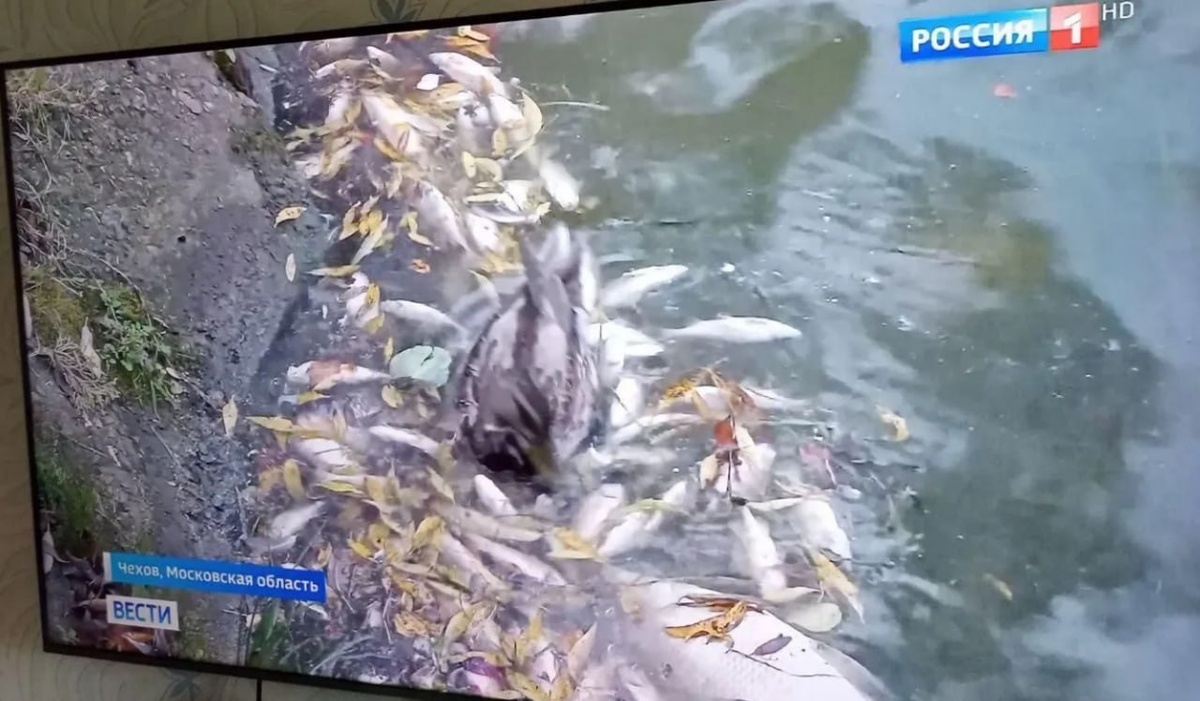 Телеканал “Россия 1” снял сюжет о массовой гибели рыбы в каскадном пруду реки Теребенки в центра Чехова