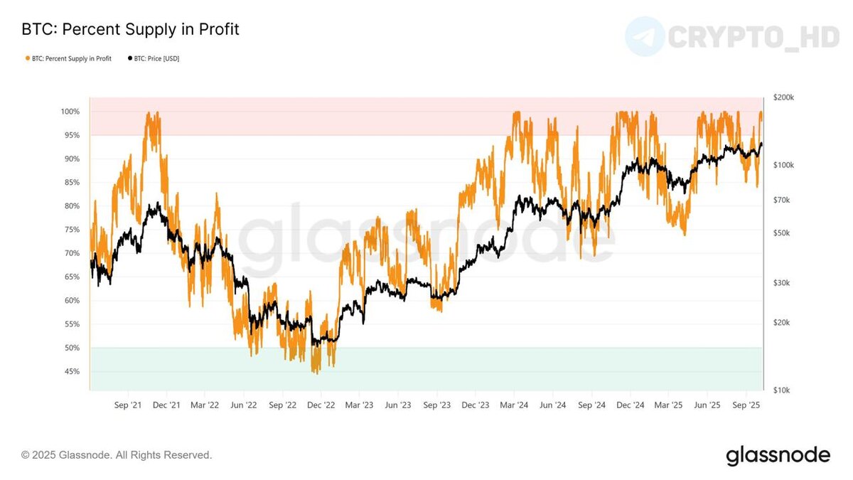 #ончейн 🔪 Glassnode: Более 95% холдеров Биткоина сейчас в плюсе – наступила фаза эйфории, когда инвесторы фиксируют прибыль и повышается волатильность. Crypto Headlines