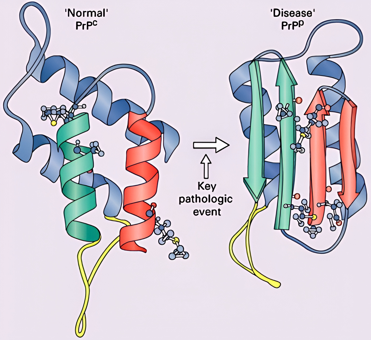 В основе всех классических прионных болезней (болезнь Крейтцфельдта-Якоба у человека, скрепи у овец, «коровье бешенство») лежит один-единственный белок — PrP. В норме он присутствует в наших нейронах в здоровой, правильно свёрнутой форме (PrPC), где он участвует в защите клеток от стресса.