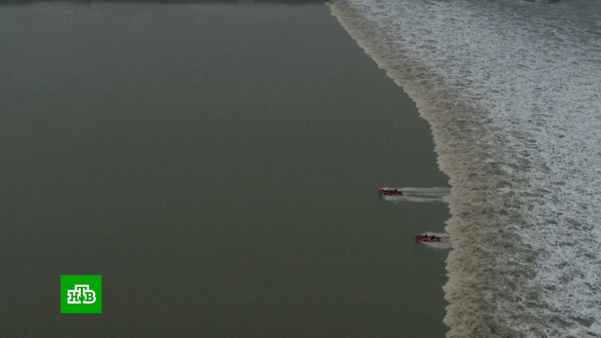 [ Смотреть видео на сайте НТВ ] Тысячи туристов приезжают на юго-восток КНР, чтобы увидеть впечатляющее природное явление. Впечатляющие кадры сняли в Китае, где в эти дни можно наблюдать мощный прилив в устье реки Цяньтан. Гигантская волна со скоростью под 40 километров в час несется вверх по течению. Из-за песчаных отмелей, действующих как трамплины, высота вала может достигать 10 метров. Посмотреть на природное явление, которое в Китае называют «Серебряный дракон», собираются тысячи туристов. Самые смелые устраивают гонки на лодках перед приливной волной. [ Смотреть видео на сайте НТВ ]