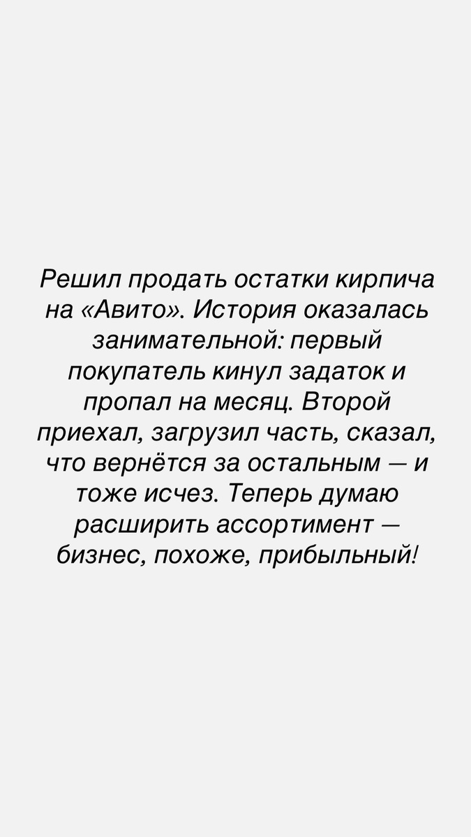 Решил продать остатки кирпича на «Авито». История оказалась занимательной: первый покупатель кинул задаток и пропал на месяц. Второй приехал, загрузил часть, сказал, что вернётся за остальным — и тоже исчез. Теперь думаю расширить ассортимент — бизнес, похоже, прибыльный!