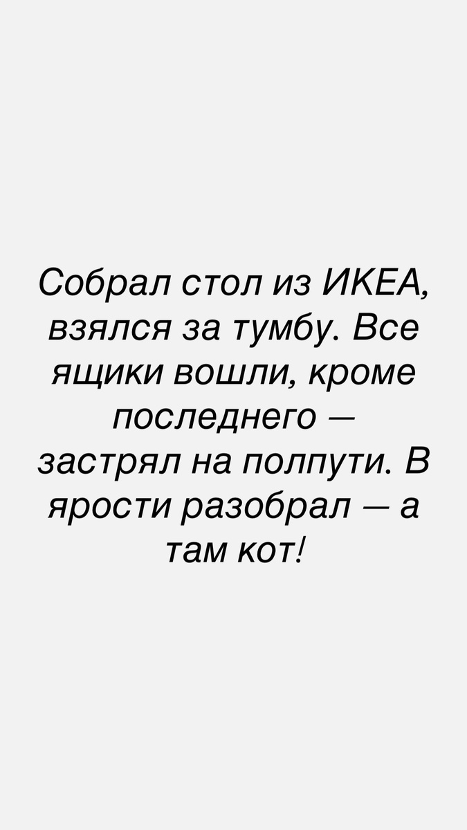 Зашёл в магазин за маркером для CD-дисков. Продавщица, не отрываясь от маникюра, решила продемонстрировать качество маркера на лупе. Результат — грязное стекло и чёрные пальцы. С обидой в голосе: «Ну почему все мужчины такие провокаторы?!» Муж пошёл с годовалым ребёнком на прививку. На просьбу врача закатать рукав, начал ставить малыша на колени. Медсестра хохотала, а мы краснели от стыда. Сын во втором классе читал про Петра I, но римские цифры ещё не проходили. Поэтому император у него превратился в «Петра-палочку». Собрал стол из ИКЕА, взялся за тумбу. Все ящики вошли, кроме последнего — застрял на полпути. В ярости разобрал — а там кот! Задержалась в туалете, приводя себя в порядок. Коллеги подсунули под дверь записку: «Твоя взяла, согласны на любой выкуп, только верни кофеварку!» Судовой повар Серёга жене говорил, что работает матросом. Когда она увидела его в колпаке и фартуке, только и спросила: «Ты умеешь готовить?» Сидел в буфете, рядом парень отошёл за хлебом. В окно в
