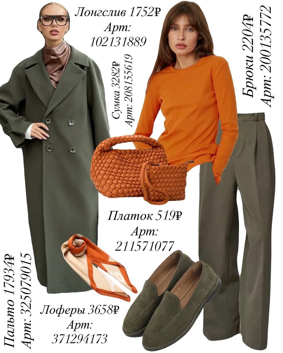 - Смешение двух миров: брюки олива 200135772 + бомбер 330805156 + лонгслив апельсин 102131889 — жёсткий верх и тёплый акцент.