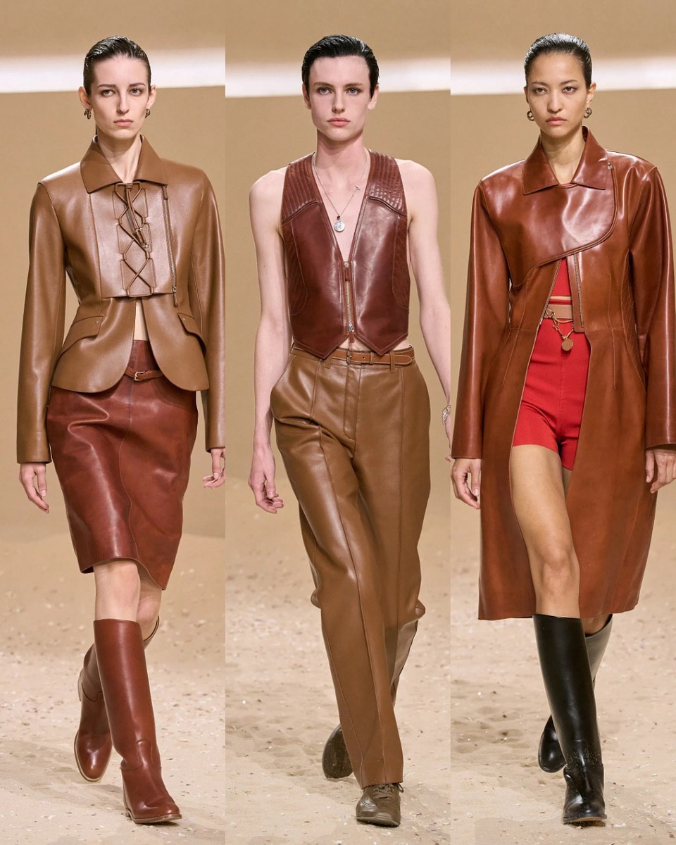 Показ Hermès весна–лето 2026 прошёл в Париже, в здании казармы Garde Républicaine — пространстве, где всё дышит историей и ремеслом. Для дома, чья история тесно связана с миром верховой езды, это стало символичным выбором. От этой точки опоры Надеж Ванэ-Сибульски выстроила сюжет коллекции: путь от дисциплины к свободе, от узды к ветру, от традиции к движению. Вдохновением стал юг Франции — Камарг, его белые лошади, солёный воздух и ощущение бескрайнего простора. Вся коллекция звучала как гимн свободе и чувственности — через кожу, ткань, шаг, дыхание. Концепция Вместо прямых цитат «вестерна» — точные коды Hermès, переосмысленные для города: кожаные корсеты-шлеи поверх бандо и сорочек, стёганые куртки в духе амазонок, платки, зафиксированные ремнями. Это не костюм, а состояние внутренней свободы. Ванэ-Сибульски снова говорит о женщине, которая движется легко, но держит себя уверенно — в тишине, в выверенности каждого жеста. Цвета Палитра земли и солнца: коричневый, оливковый, песочны