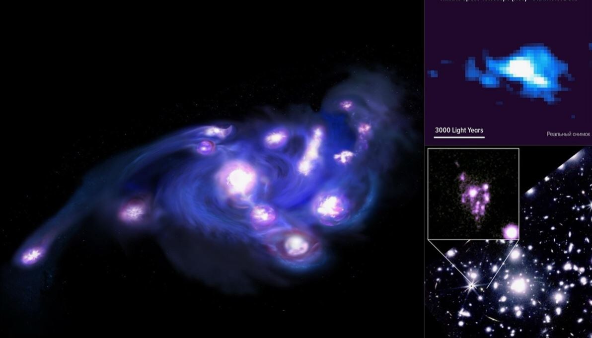 И первым с задачей справился не «Уэбб», а – старый конь борозды не портит, – «Хаббл», обнаруживший галактику Виноград возрастом 12.7-12.8 миллиардов лет. И тут, собственно, комментарии излишни, – галактика видна в момент, когда образуется путём слияния десятка голубых компактных сферических карликовых галактик. Они закручиваются в общем гравитационном поле и «перемалываются», – разрываются приливными силами, как это происходит с телами в сфере Роша планет-гигантов.
