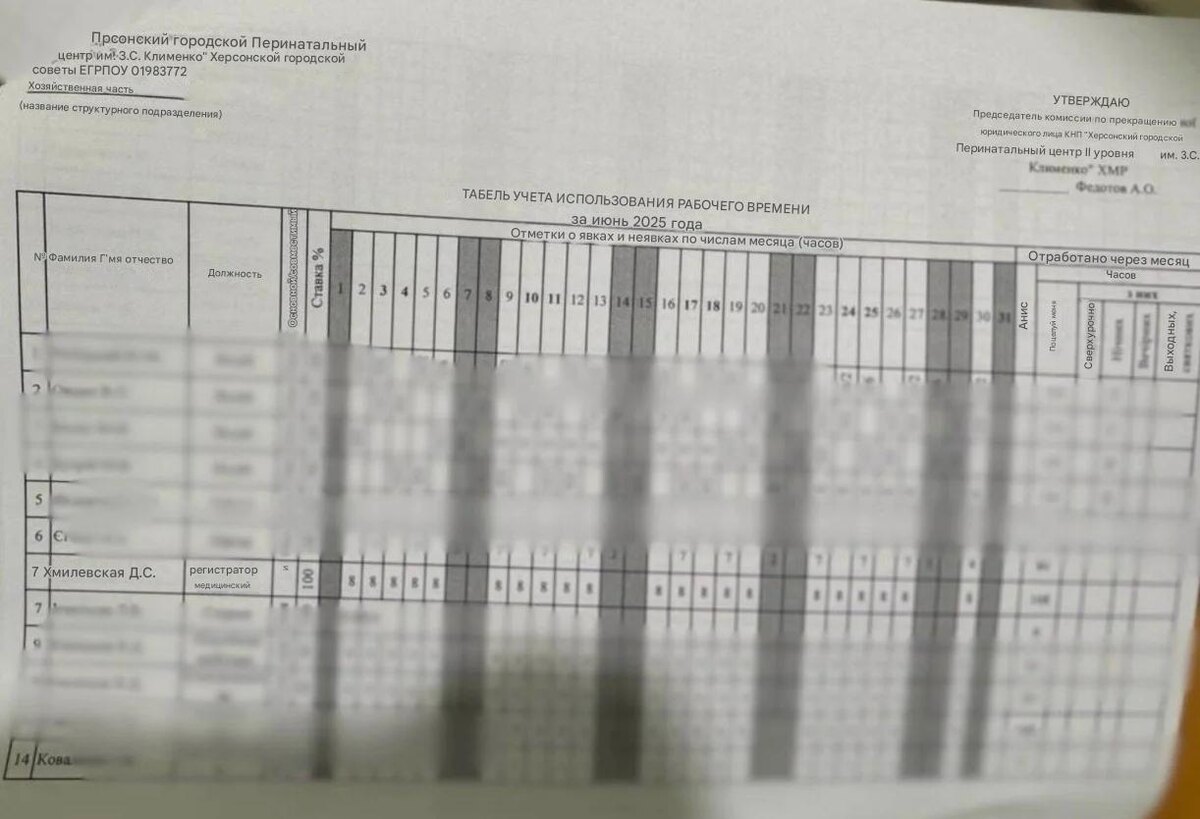 Из страны девушка выехала 1 июня через пункт «Краковец» и вернулась 15-го в одной «маршрутке» с мамой. Правда, согласно табелю, эти две недели она «трудилась» в Херсоне как ни в чём не бывало.