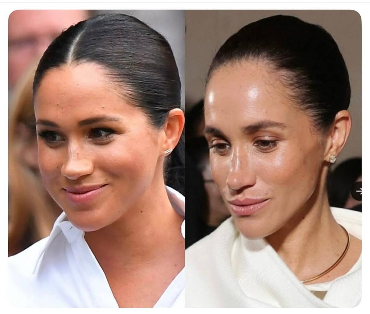 После появления на показе Balenciaga Меган Маркл начали подозревать в пластике. Исследуя две фотографии с разницей в шесть лет, инста-эксперты пришли к мнению, что 44-летняя герцогиня изменила нос, переделала челюсть, вытянула уши, а также не обошлось без ботокса на лбу. Вторая часть критиков считает, что Меган не прибегала ко всему вышеперечисленному, а всего лишь выспалась злоупотребляет оземпиком - отсюда и следствие в виде «оземпикового лица».
