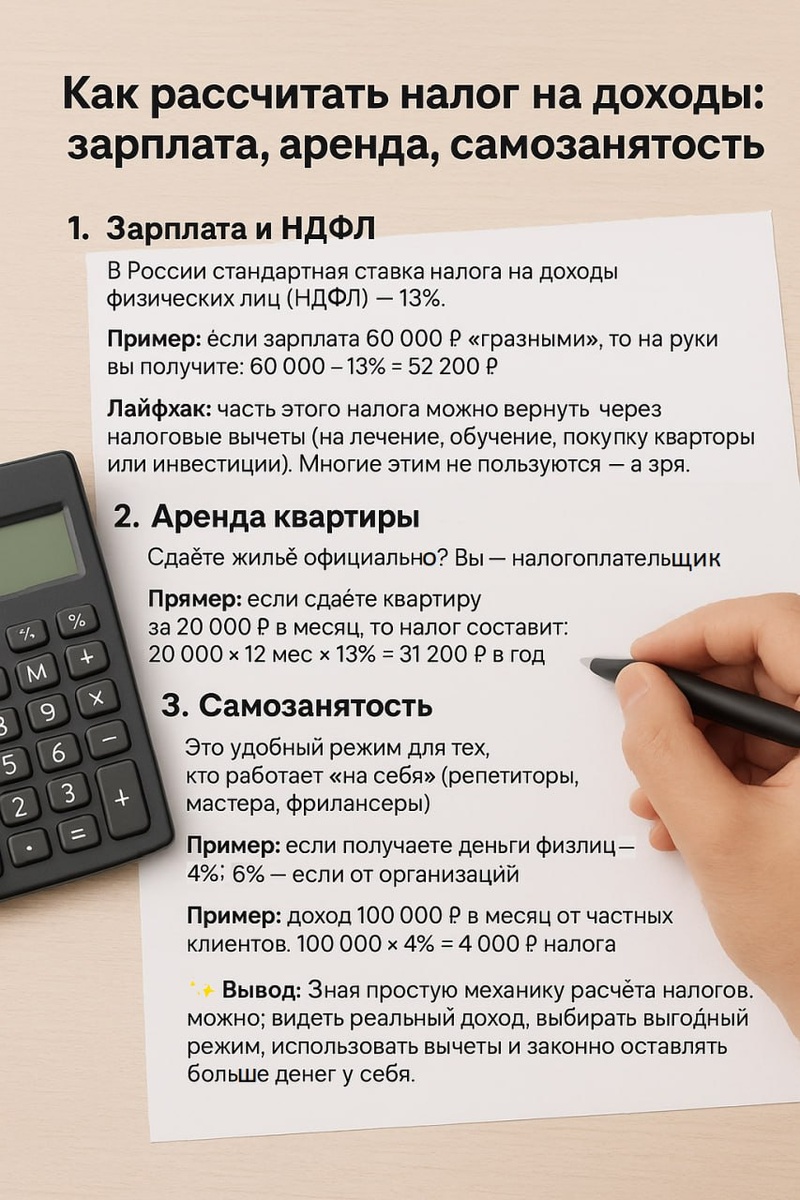 🧐 Как рассчитать налог на доходы: зарплата, аренда, самозанятость 📊 Многие уверены: налоги — это «где-то там», пусть считает бухгалтер. Но если мы не понимаем, сколько и за что платим, легко теряем деньги и возможности. Давайте разберёмся простыми примерами 👇 1️⃣ Зарплата и НДФЛ 🔹 В России стандартная ставка налога на доходы физических лиц (НДФЛ) — 13%. Пример: если зарплата 60 000 ₽ «грязными», то на руки вы получите: 👉 60 000 – 13% = 52 200 ₽. 💡 Лайфхак: часть этого налога можно вернуть через налоговые вычеты (на лечение, обучение, покупку квартиры или инвестиции). Многие этим не пользуются — а зря. 2️⃣ Аренда квартиры Сдаёте жильё официально? Вы — налогоплательщик. 🔹 Здесь тоже действует ставка НДФЛ 13%. Пример: если сдаёте квартиру за 20 000 ₽ в месяц, то налог составит: 👉 20 000 × 12 мес × 13% = 31 200 ₽ в год. 💡 Если оформить статус самозанятого, налог снижается до 4% (на физлиц). В нашем примере: 20 000 × 12 × 4% = 9 600 ₽ в год. Разница ощутимая, правда? 3️⃣ Самозаня
