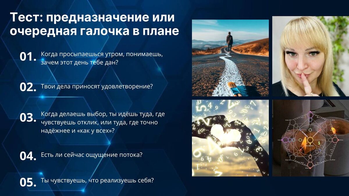 Тест: предназначение или очередная галочка в плане Ты можешь быть активной, ответственной, даже успешной, но если ты не идёшь в согласии со своим предназначением, всё внутри будто затухает. Снаружи жизнь бьет ключом, а внутри — пустая тишина. Кажется, что всё идет своим чередом, но радости это не приносит. Делаю все как надо, но будто не нахожу в этом смысла. Я устала искать верное направление. Но это не усталость, не апатия и не лень. Это душа, которая сбилась со своего маршрута. Попробуй пройти мини-тест и почувствуй, в какой точке ты сейчас: 1️⃣ Когда просыпаешься утром, понимаешь, зачем этот день тебе дан? Или чаще включаешься на автомате, просто делаешь то, что должна? 2️⃣ Твои дела приносят удовлетворение? Ты чувствуешь отклик, смысл, вдохновение или это просто очередная галочка в списке? 3️⃣ Когда делаешь выбор, ты идёшь туда, где чувствуешь отклик, или туда, где точно надёжнее и «как у всех»? 4️⃣ Есть ли сейчас ощущение потока? Когда всё складывается само, приходят