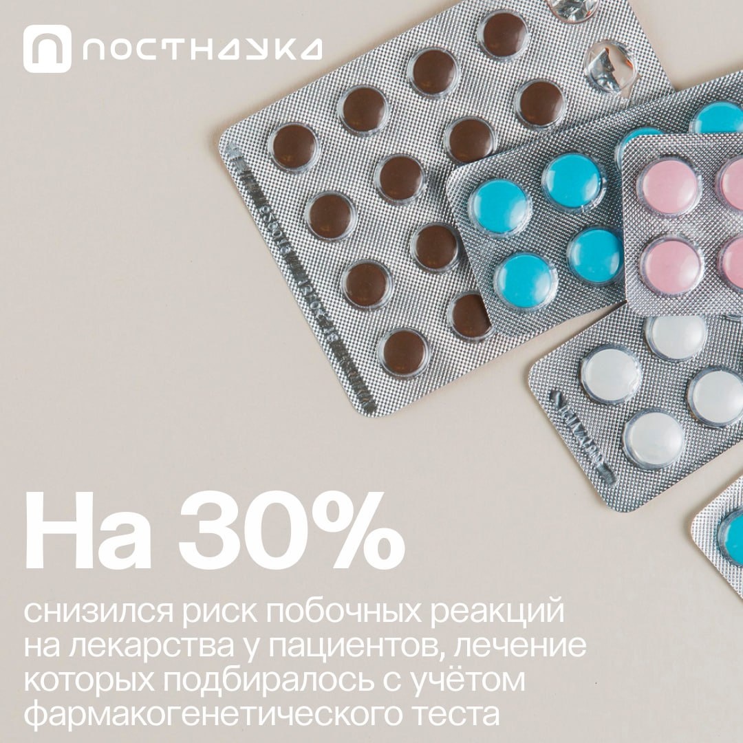 В феврале 2023 года медицинский журнал The Lancet опубликовал исследование, в котором в течение 5 лет отслеживались случаи нежелательных реакций на лекарства у двух групп пациентов. Первая группа получала лечение с учетом результатов фармакогенетического теста, вторая — без него. В результате риск побочных эффектов в «генетически информированной» группе снизился более чем на 30%, причем анализ проводился всего по 12 генам. И это далеко не единственное преимущество фармакогенетического подхода: https://youtu.be/MrekhO54_Rw.