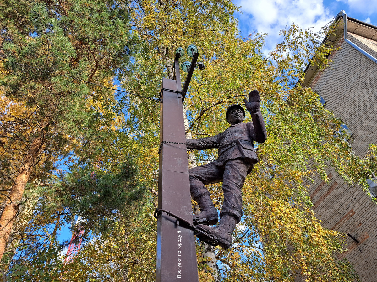 Ещё одна интересная жанровая скульптура посвящена тем, кто обеспечивает бесперебойное электроснабжение в Новосибирской области. Находится она тоже рядом со станцией метро «Маршала Покрышкина». Чтобы её разглядеть, нужно поднять голову вверх, потому что этот электромонтёр, как и полагается, находится на работе — на фонарном столбе около здания «Новосибирских городских электрических сетей». Памятник открыли к 80-летию развёртывания электрических сетей в области. А неподалёку есть граффити, посвящённое уже 90-летию электрических сетей области. Посмотреть на скульптуры в ближайших дворах можно по ссылкам внизу: Двор с фонтаном и скульптурой «Клоун» Удивительные достопримечательности на Покрышкина Ящерица на камнях Скульптура «Царевна-лягушка» Секреты улицы Крылова в Новосибирске или как приманить деньги ;) Литературный сквер Кот в сапогах Граффити от метро Покрышкина и дальше Арлекин на моноцикле 🤹 Вовка из Тридевятого царства в осеннем Рябиновом сквере Серый Волк в уютном дворике Детали