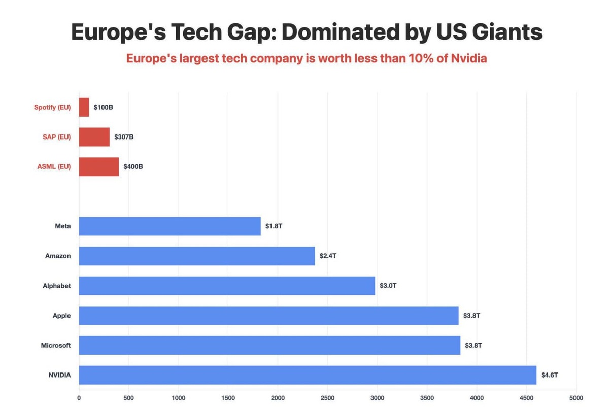 Насколько США впереди по капитализации их ИТ- гигантов. Даже впереди ЕU. Лидеры европейского технологического рынка: ASML (№27, $400 млрд), SAP (№36, $307 млрд), Spotify (№129, ~$100 млрд). Тем временем, США: 1-Nvidia ($4,52 трлн), 2-Microsoft ($3,93 трлн), 3-Apple ($3,81 трлн), 4-Alphabet ($3,03 трлн), 5-Amazon ($2,36 трлн), 6-Meta ($1,80 трлн). Правда есть Китай :) Русский ИТ бизнес