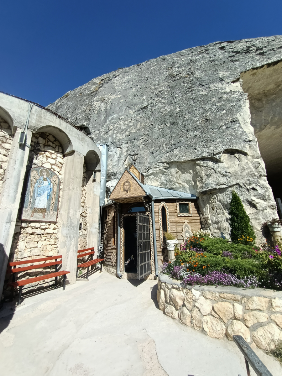 В пещере создан храм во имя святой Анастасии Узорешительницы, имеющий к предыдущим общее только по названию, даже внутри он вряд ли похож на тот первый. Его интерьер сделан из бисера, особенно много его на входе и на потолке храма. Фотографировать внутри я не стал, а вот посмотреть его рекомендую, он очень уникален.