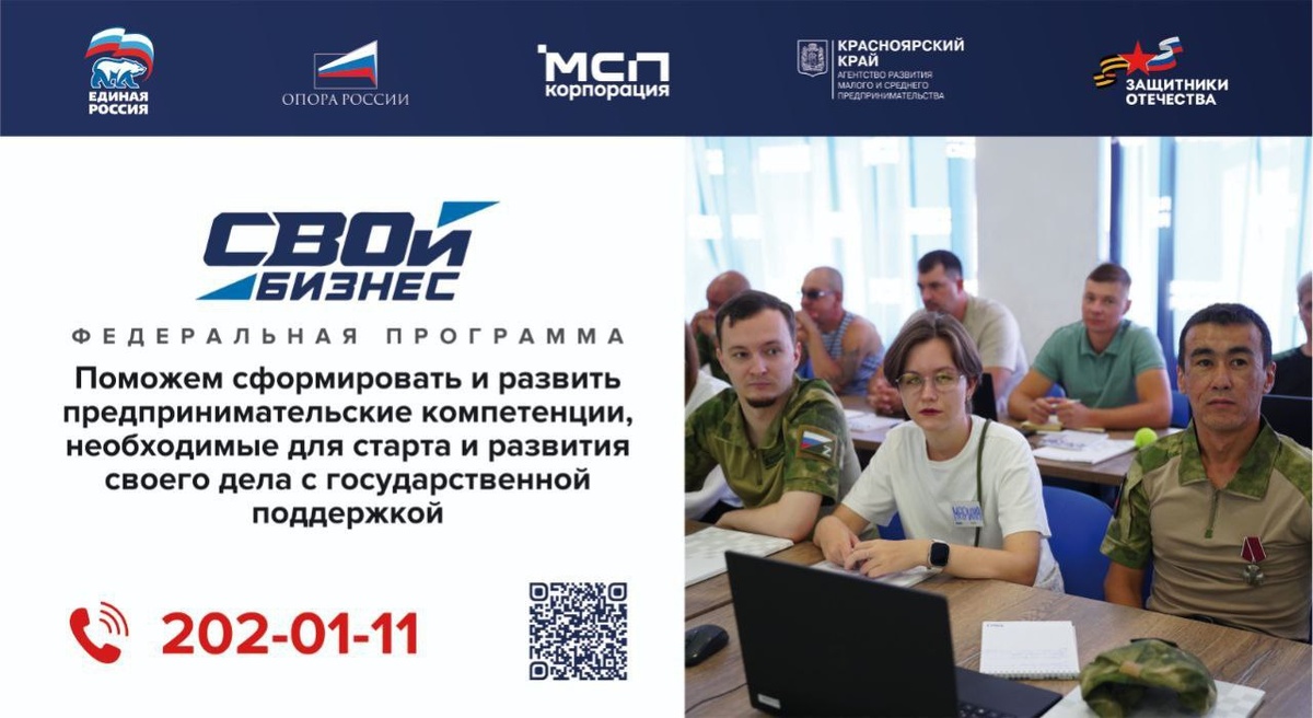 С 1 декабря в Красноярске на площадке Центра «Мой Бизнес» начнется образовательная программа «СВОй бизнес», направленная на поддержку ветеранов боевых действий, участников специальной военной операции и членов их семей. В рамках программы запланировано обучение от экспертов, консультации с наставниками, пошаговая подготовка к открытию собственного дела, а также информирование о мерах государственной поддержки предпринимательства. Проект реализуется при поддержке партии «Единая Россия», Общероссийской общественной организации малого и среднего предпринимательства «ОПОРА РОССИИ», Корпорации МСП и Фонда «Защитники Отечества». Подать заявку на участие можно до 20 ноября на цифровой платформе МСП или по тел. 202-01-11 Программа «СВОй бизнес» предоставляет участникам возможность получить практические знания, профессиональную поддержку и уверенно начать собственное дело.