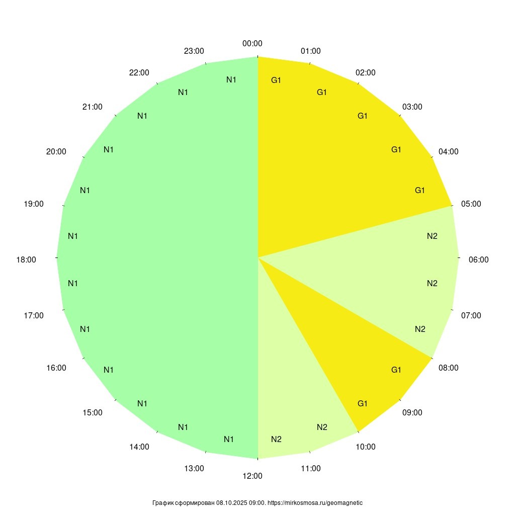 Геомагнитный прогноз на 8.10.2025: ожидается, что с 09:00 будет геомагнитная буря класса G1 (Незначительная, Kp=4.67), с 10:00 до 12:00