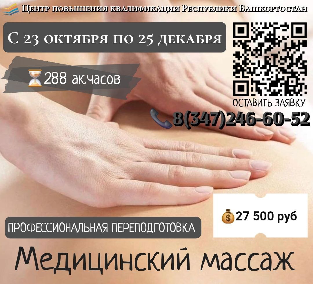 🔥Пройди профессиональную переподготовку и стань востребованным специалистом! 📅С 23 октября по 25 декабря Центр повышения квалификации предлагает своим слушателям пройти профессиональную переподготовку по актуальной программе «Медицинский массаж». ⏳Продолжительность обучения: 288 академических часов. 🎓Целевая аудитория: средние медицинские работники, имеющие базовое образование по специальности «Лечебное дело», «Акушерское дело», «Сестринское дело». 💰Стоимость обучения: 27 500 руб. 📄По окончании слушатели получат диплом о профессиональной переподготовке с внесением данных в ФИС ФРДО. 📌Прохождение первичной специализированной аккредитации возможно на базе Центра сразу после завершения обучения. ☎️Контактный телефон: 8(347)246-60-52. 📩Эл. почта: manager@medupk.ru ➡️Заявку можете оставить на нашем сайте: https://clck.ru/398sTB