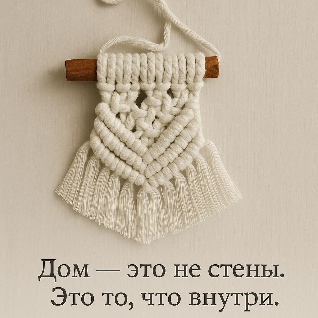 Иногда ловлю себя на мысли, что дом - это не адрес и не количество комнат. Это место, где ты можешь быть собой. Где кружка не спешит остывать, где на стене весит вещь с историей, а запах корицы говорит :" всё хорошо". Каждый раз, когда я делаю новое панно, думаю не о шнурах и узлах, а о том, в каком доме оно окажется. Кто повесит его рядом с зеркалом или подарит подруге, чтобы сказать без слов:" ты мне дорога". Дом - это не стены. Это моменты, из которых складывается тепло. А что делает ваш дом особенным?