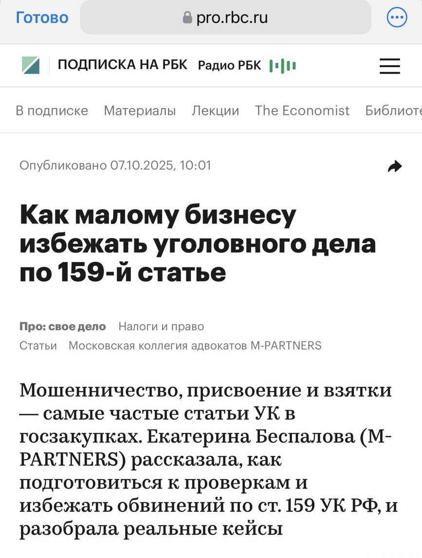 Вчера на РБК вышла статья управляющего партнёра коллегии адвокатов M-PARTNERS Екатерины Беспаловой: «Госзаказ для МСБ: как не заработать контракт и уголовное дело» Государственный контракт для малого и среднего бизнеса часто воспринимается как стратегический прорыв — стабильность, престиж, новые возможности. Но на практике это не только шанс, но и зона повышенных уголовно-правовых рисков. Мы решили поделиться этим материалом и здесь, в Дзене, чтобы предприниматели могли вовремя увидеть и понять, какие ошибки могут стоить свободы и репутации. Госзаказ и уголовный риск: где проходят границы ответственности Когда предприниматель заходит в систему государственных закупок, он думает о развитии. Но редко — о том, как грамотно выстроить юридическую защиту. Ошибки в документах, устные договорённости или неточности в сроках исполнения могут привести к уголовному делу. Наиболее частые статьи, по которым возбуждаются дела в сфере госзакупок: ст. 159 УК РФ (мошенничество), ст. 160 (присвоени