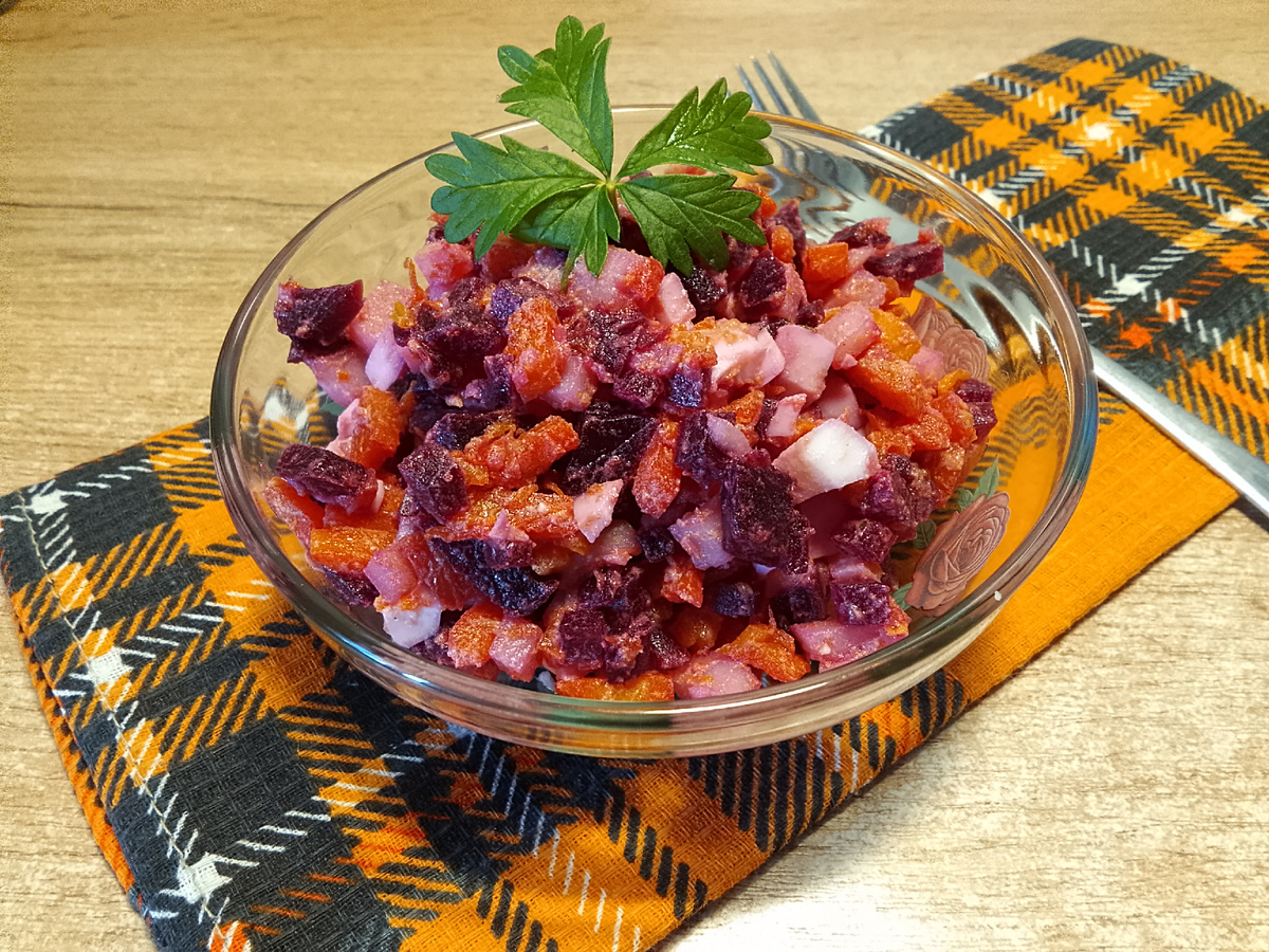 Стол №5 по-Певзнеру. Салат из вареных овощей с яичным белком и тыквенной заправкой.