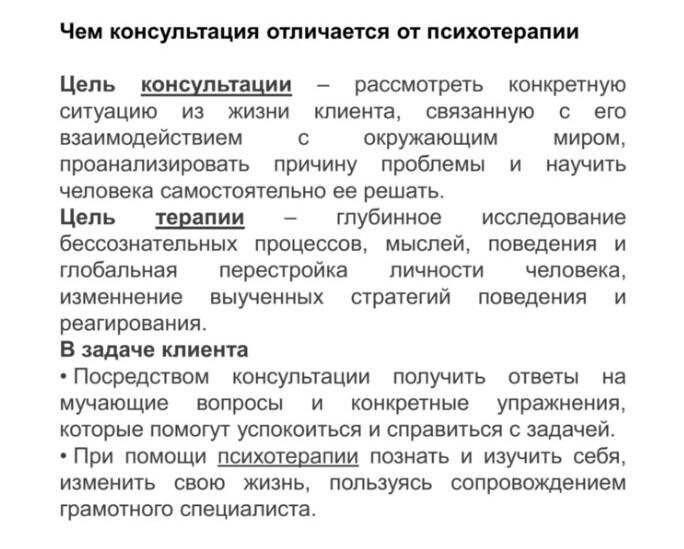 Вчера два клиента задали один и тот же вопрос про стоимость моих услуг. Значит, не всё видно, очевидно 🙄 На всякий случай также прикладываю полезный скрин, чем консультация отличается от терапии. 🤍🤍🤍🤍🤍🤍🤍🤍🤍 🤍🤍🤍🤍🤍 Индивидуальная сессия: 1 сессия — online — 8.000 р. 1 сессия — offline Москва / Ивантеевка — 10.000 р ~ 60-90 мин Семейная / парная сессия 1 сессия — online — 10.000 р. 1 сессия — offline Москва / Ивантеевка — 12.000 р ~ 90 - 120 мин Участие в трансформационной игре: online — 3.000 р offline — 5.000 р ~ 3-4 часа 🤍 Открыта к сотрудничеству с бизнес-проектами. Написать мне лично, задать вопрос ✉️ @Any_Kovalenko