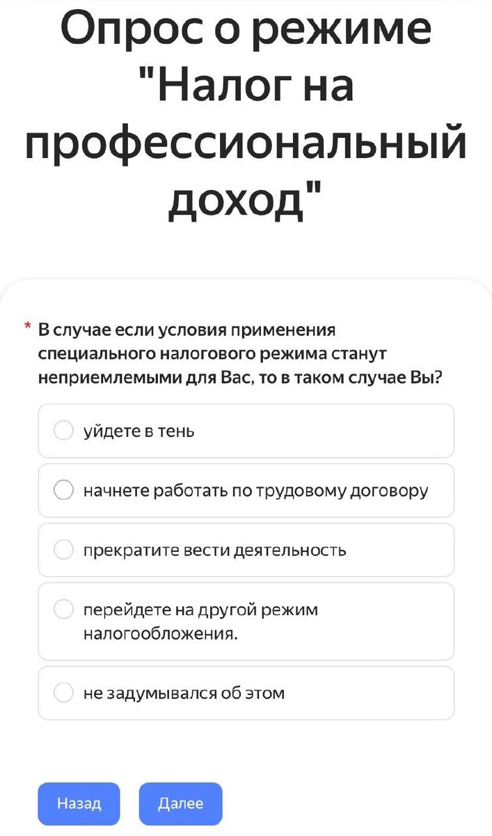 Какой налог — справедливый? В личных кабинетах на платформе «Мой налог» появился опрос от Федеральной налоговой службы. Самозанятым предлагают ответить, какую ставку налога они считают «справедливой» — от 0% до свыше 20%. Кроме того, участников спрашивают, что они сделают, если условия режима станут неприемлемыми — уйдут в тень, сменят систему налогообложения, найдут работу по найму или прекратят деятельность.