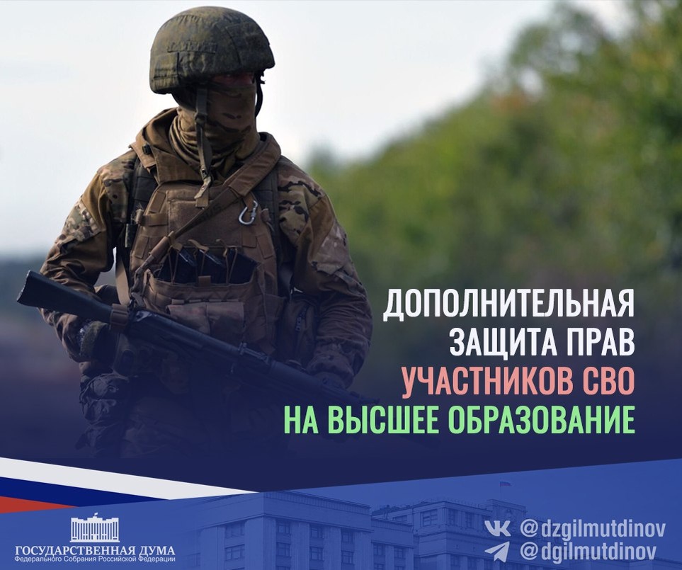 Приняли закон, исключающий период службы на СВО из сроков действия результата олимпиад. Если школьник участвовал в олимпиаде, получил аттестат, а затем был призван на срочную службу или с 18 лет решил уйти на спецоперацию, срок действия итогов, полученных на олимпиаде, будет заморожен и возобновится после окончания службы. Как вы помните, с 3 августа действует принятый ранее Госдумой закон, в соответствии с которым для участников специальной военной операции на время их службы приостанавливается срок действия результатов единого государственного экзамена. Это будет способствовать повышению доступности образования для защитников Родины, и позволит им адаптироваться по окончании службы. Вопрос поддержки участников СВО остается для Государственной Думы приоритетным. #динаргильмутдинов #ЕдинаяРоссия #госдума ЕР Госдума восьмойсозыв