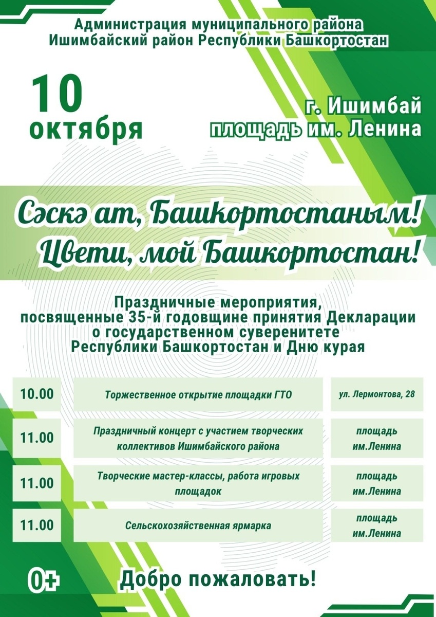 Чествование работников города и района, концерт лучших исполнителей, а также познавательно-развлекательные мероприятия для жителей разного возраста – всё это обещают устроить в Ишимбае 10 октября. Именно в этот день в городе отметят День Республики Башкортостан, сообщает администрация муниципального района. Веселье и радость творчества будут царить на площади имени Ленина. Начало праздника – в 11 часов. Напомним, что 11 октября в регионе отмечается 35-летие принятия Декларации о государственном суверенитете РБ. В честь Дня Республики в Башкирии уже проходят тематические уроки в школах, культурные мероприятия, спортивные состязания. 0+