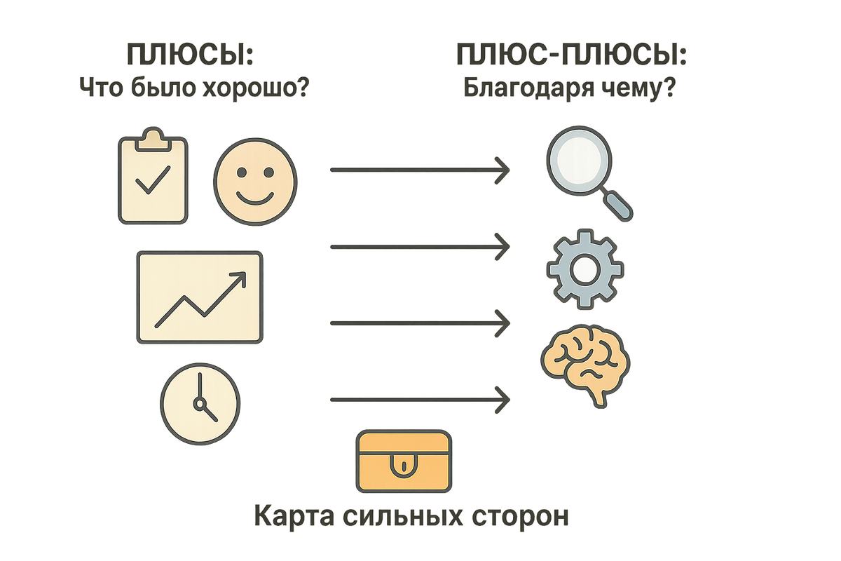 Техника «Плюсы и плюс-плюсы» является простым и эффективным инструментом рефлексии, который смещает акцент с поиска недостатков на фиксацию и анализ позитивного опыта.