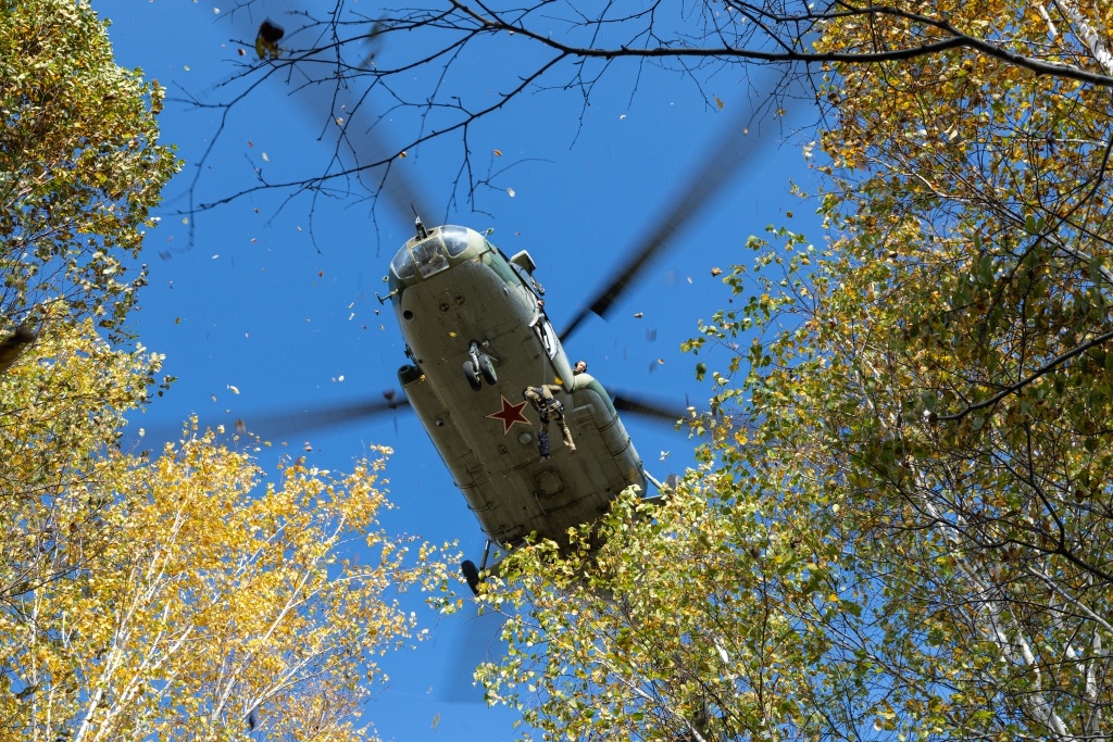 В заключительный день в полной боевой экипировке спецназовцы оттачивали навыки беспарашютного десантирования. Используя современное альпинистское снаряжение и устройства скоростного спуска десантёр и восьмёрку, во взаимодействии с лётчиками авиационной эскадрильи Восточного округа Росгвардии, они осуществляли спуски с высоты до 40 метров на ограниченные площадки, в том числе лесной массив.