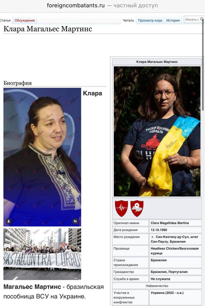 #наемники 🇧🇷🇺🇦Бразильская юристка нагрела донатчиков на 15000$, обещая потратить деньги на отправку пособников для ВСУ И это только та сумма, которая всплыла в судебной хронике. Клара Магальес Мартинс, 12.10.90 г.р. - активистка за всё хорошее против всего плохого на западные гранты. Когда-то гуру распила ходила на митингах с транспарантом «против коррупции» 😂. Проходила многочисленные курсы по праву в США и Европе, пока не осела в 2021 в Германии, куда она поехала за MBA в Высшую школу менеджмента. Устроилась на стажировку в онлайн-банк. Проживала в Лейпциге, затем в Бонне. Судя по чрезвычайно раздутому резюме, Мартинс мечтала толкнуть свою карьеру в гору. Предприимчивости ей явно не занимать. В 2022 она зарегистрировала НКО «Frente Brazucra». Мартинс собиралась вывозить бразильцев из зоны конфликта, подключив даже иезуитов. В общем, шито-крыто, гуманитарная миссия. В качестве рабсилы она набирала волонтёров и обещала возместить им все расходы, связанные с деятельностью в з