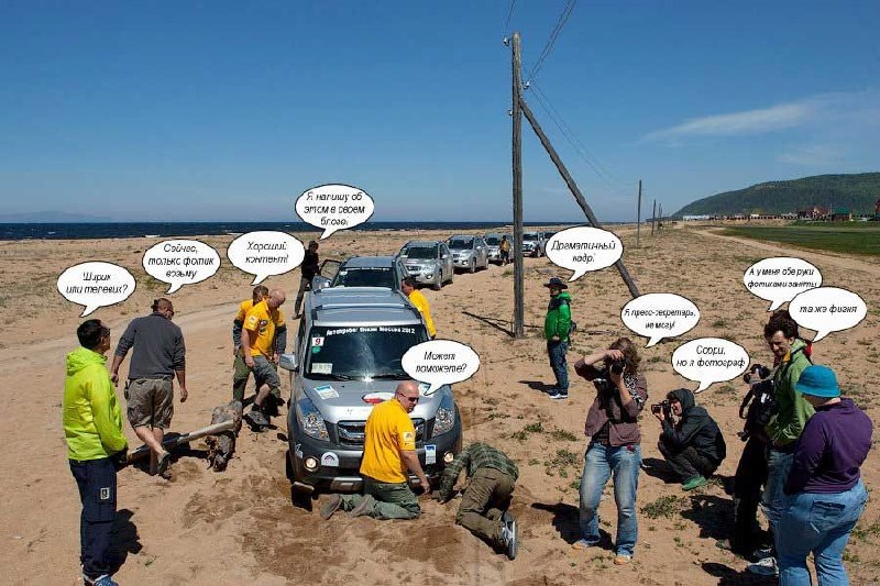 Спасательная операция имени лайков и репостов Вот так рождается контент: 🚫 Один застрял 📸 Пятеро снимают: - Я напишу об этом в своём блоге! - Хороший кадр! - Сейчас, только фотик возьму! - Я пресс-секретарь! - Я фоткаю драму! ❓ И только один тихо шепчет: -Может, поможете?.. 😂 Каждый кадр - о людях, которые умеют видеть приключение даже там, где другим видится «проблема». Вот в этом и есть кайф пути. И в каждой такой ситуации рождается драма, юмор и дружба. А ещё рождаются великие экспедиционные кадры - где каждый занят делом, но только у машины одно дело - выбраться 😅