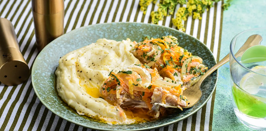 Это простая в исполнении и очень вкусная еда. Скумбрия — прекрасный полезный продукт не только для засолки и маринования. Мы потушим ее в сковороде с самыми простыми овощами — луком и морковью. Сметана придаст этой сочной и мясистой рыбке чудесный сливочный вкус. Часто скумбрию в сметане с овощами тушат, не удаляя кости из кусочков. Но сами подумайте: то, что нормально для жареной рыбы, не особо подходит для тушеной в соусе с другими ингредиентами. Выковыривать из этой массы рыбные косточки — так себе идея. Лучше наслаждаться едой, не думая о помехах. Для блюда понадобится: Лук репчатый 100 г Сметана 18% 75 г Масло сливочное 20 г Масло растительное рафинированное 2 ст.л. Мука пшеничная 2 ст.л. Паприка сушеная 1 ч.л. Петрушка 20 г Лавровый лист 1 шт. Перец чёрный молотый по вкусу Соль по вкусу Разморозьте скумбрию в холодильнике, не ускоряя процесс, иначе она развалится у вас на сковороде. Выпотрошите рыбину, удалите темную пленку из брюшины, отрежьте голову, хвост и плавники, промойт