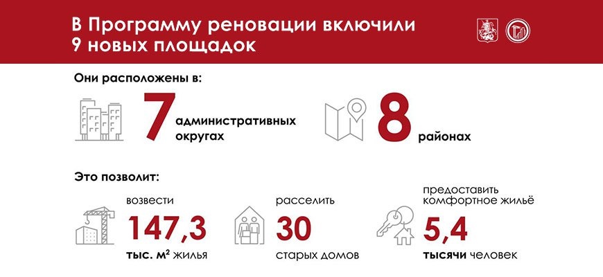 🏗 Собянин: 9 новых стартовых площадок включили в реновацию в октябре 2025 года Эти площадки, расположенные в восьми столичных районах, включают два участка, где ранее были расселены дома — они также входили в программу. По словам Собянина, ввод в эксплуатацию более 147 тысяч квадратных метров нового жилья на этих площадках позволит переселить москвичей из 30 устаревших домов. В результате около 5,4 тысячи человек получат современные комфортабельные квартиры. Смотреть адреса новых стартовых площадок: ЗАО, САО, ВАО, ЮЗАО, ЦАО, ЮВАО, ЮАО >> Подпишитесь: ▫ Реновация в Телеграм ▫ Реновация в MAX Ваши соседи уже подписались!
