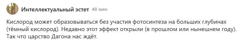 На случай, если кто-то не в курсе новостей, – ну вдруг, – в 2024 году океанологами был установлен факт повышения концентрации кислорода в придонном слое воды на глубинах свыше 4000 метров. То есть, в условиях непроницаемой темноты, делающей невозможным фотосинтез. Происхождение этого кислорода, предположительно, абиогенное. Как следствие, теперь время от времени появляются комментарии, в которых упоминается «тёмный кислород».