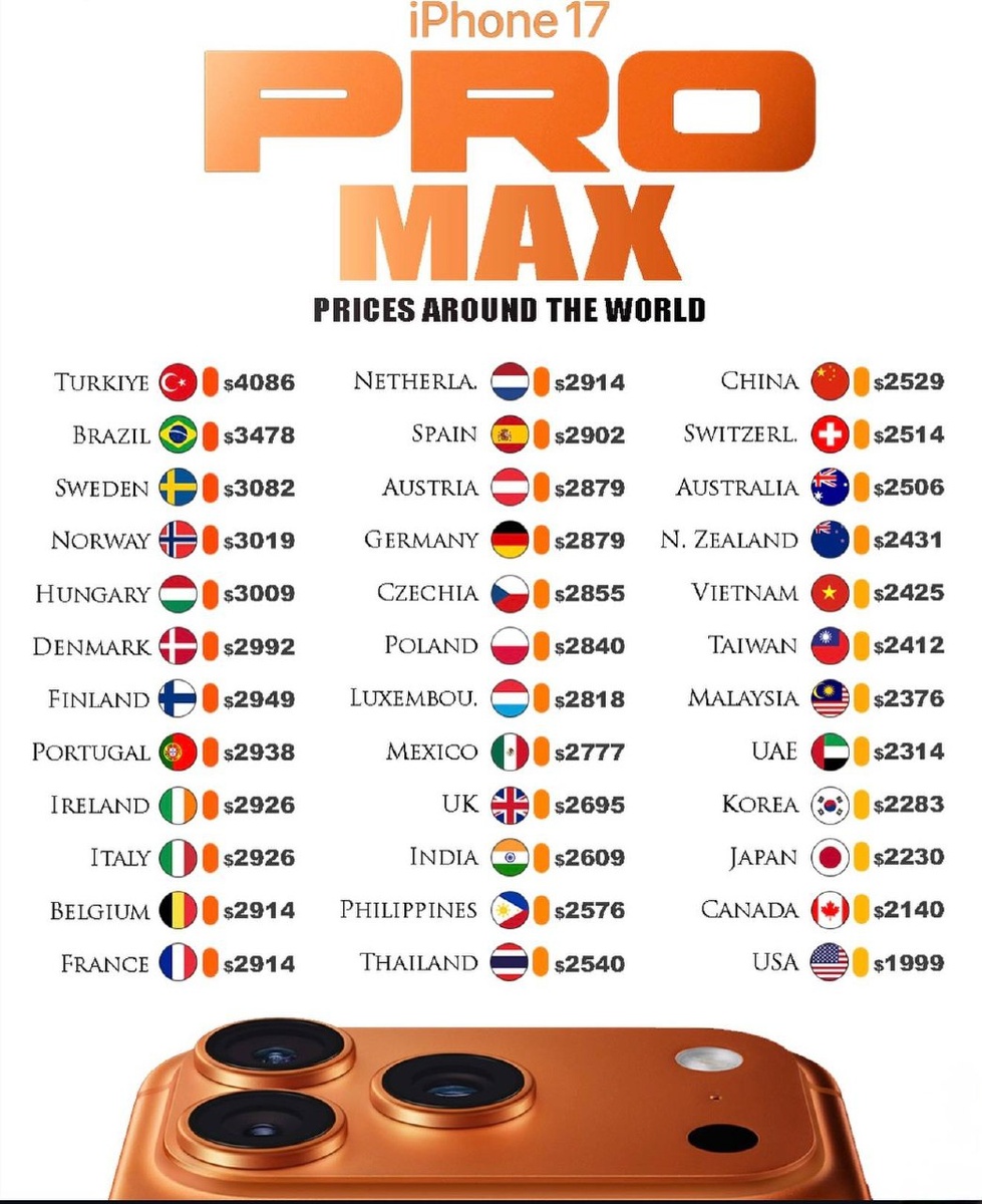 iPhone 17 Pro Max Цены по всему миру. Цена iPhone 17 Pro Мах сильно меняется в зависимости от того, где вы живете! От $1999 в США до шокирующих $4,086 в Турции