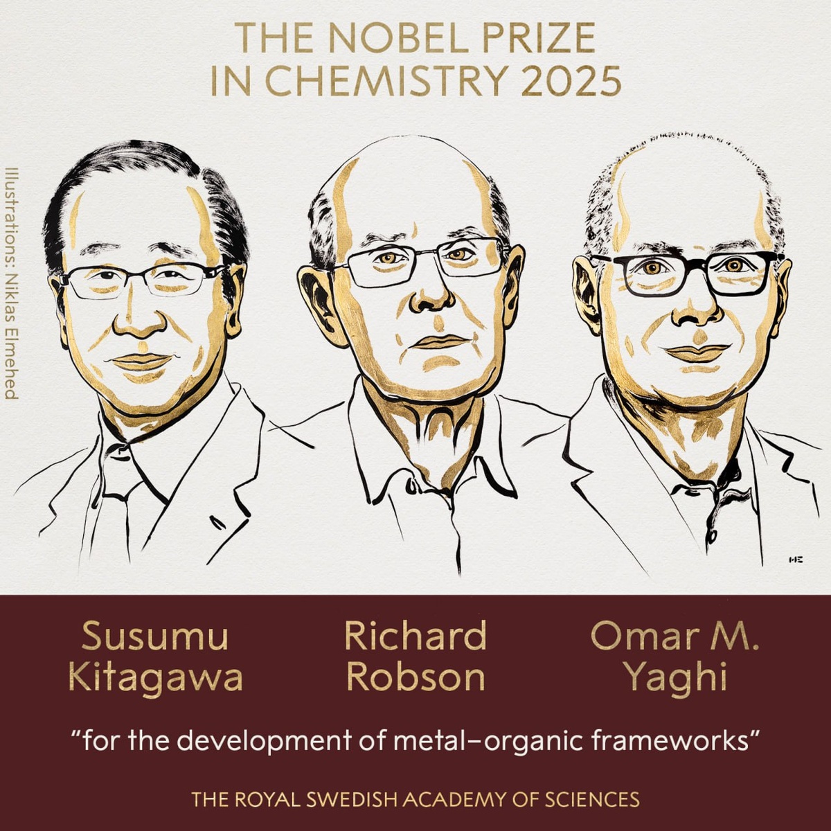 Kimyo bo‘yicha 2025-yilgi Nobel mukofoti “metallorganik tuzilmalarni ishlab chiqqani uchun” Susum Kitagava, Richard Robson va Omar M.Yagiga