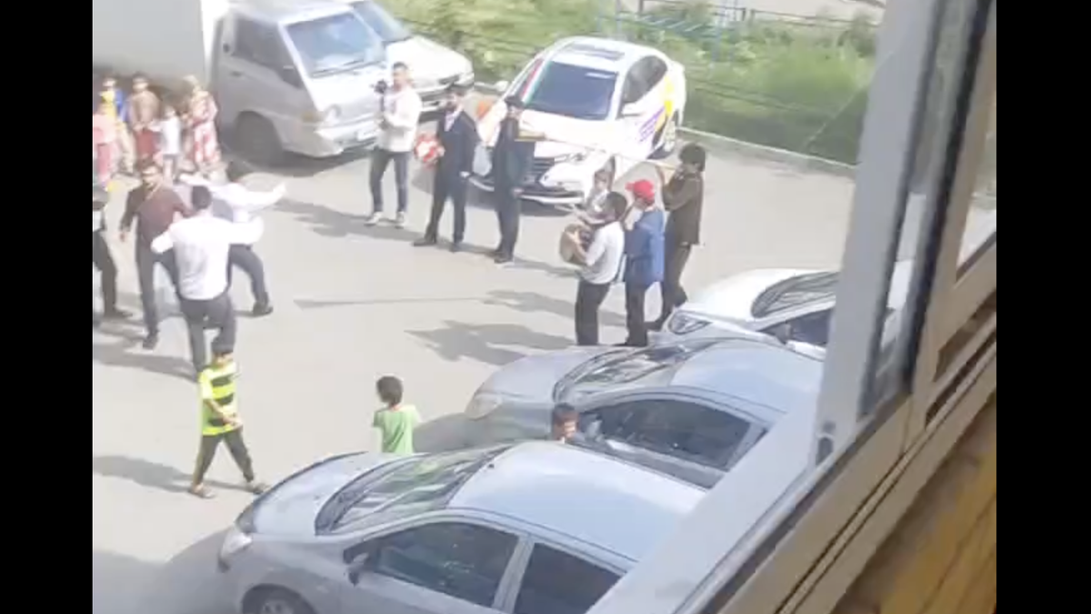 Во дворе — люди. Много. Человек двадцать, может, тридцать. Все в ярких рубахах, женщины в платках, дети в блестящих костюмах. На качелях вместо детей — миски с едой. У мусорки — стол, накрытый скатертью.