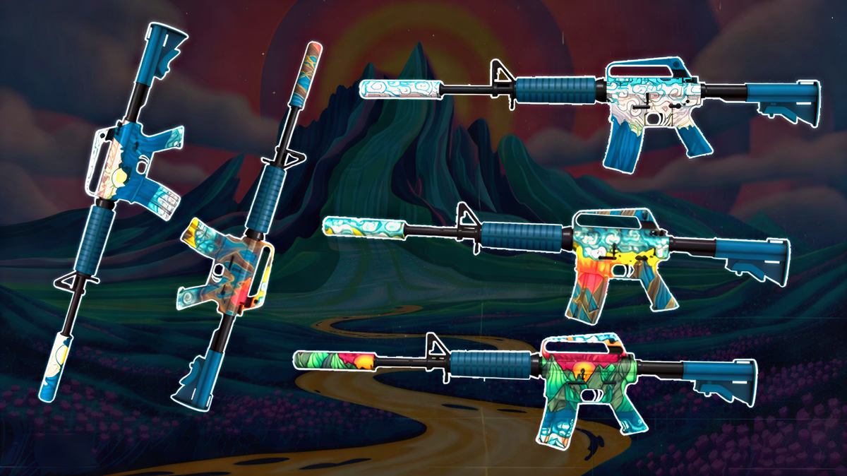 Эти паттерны выделяются желтым солнцем по центру корпуса, которое доминирует над синими пиками гор. Паттерн 321 особенно ценится за «полное покрытие» солнцем, что делает его похожим на Fade-скины по интенсивности цвета.