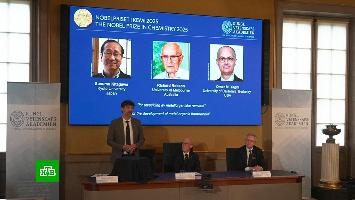 [ Смотреть видео на сайте НТВ ] Нобелевский комитет назвал имена ученых, удостоившихся премии в области химии. Лауреатами премии 2025 года стали трое ученых — Сусуму Китагава, Ричард Робсон и Омар Ягхи. Награды они удостоились за работы по металлоорганическим соединениям. Накануне были объявлены лауреаты Нобелевской премии по физике. Ее также удостоились сразу трое ученых из разных стран — британец Джон Кларк, француз Мишель Деворе и американец Джон Мартинис. Награду им присудили за достижения в квантовой механике. [ Смотреть видео на сайте НТВ ]