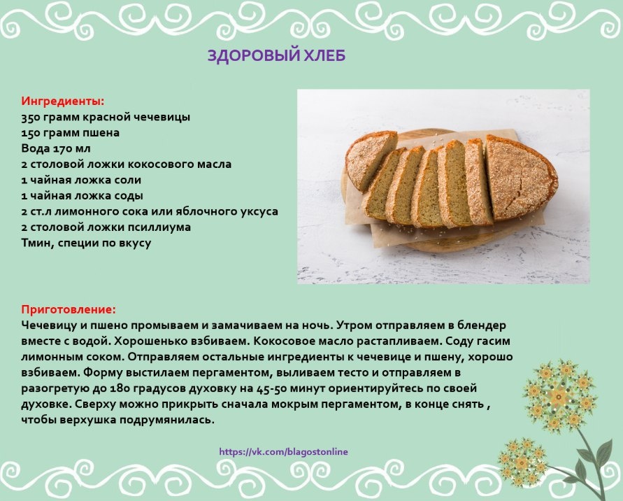 🍞 ЗДОРОВЫЙ ХЛЕБ 🌀 Ингредиенты: 350 грамм красной чечевицы 150 грамм пшена Вода 170 мл 2 столовой ложки кокосового масла 1 чайная ложка соли 1 чайная ложка соды 2 ст.л лимонного сока или яблочного уксуса 2 столовой ложки псиллиума Тмин, специи по вкусу ⠀ 🌀 Приготовление: Чечевицу и пшено промываем и замачиваем на ночь. Утром отправляем в блендер вместе с водой. Хорошенько взбиваем. Кокосовое масло растапливаем. Соду гасим лимонным соком. Отправляем остальные ингредиенты к чечевице и пшену, хорошо взбиваем. Форму выстилаем пергаментом, выливаем тесто и отправляем в разогретую до 180 градусов духовку на 45-50 минут ориентируйтесь по своей духовке. Сверху можно прикрыть сначала мокрым пергаментом, в конце снять , чтобы верхушка подрумянилась.