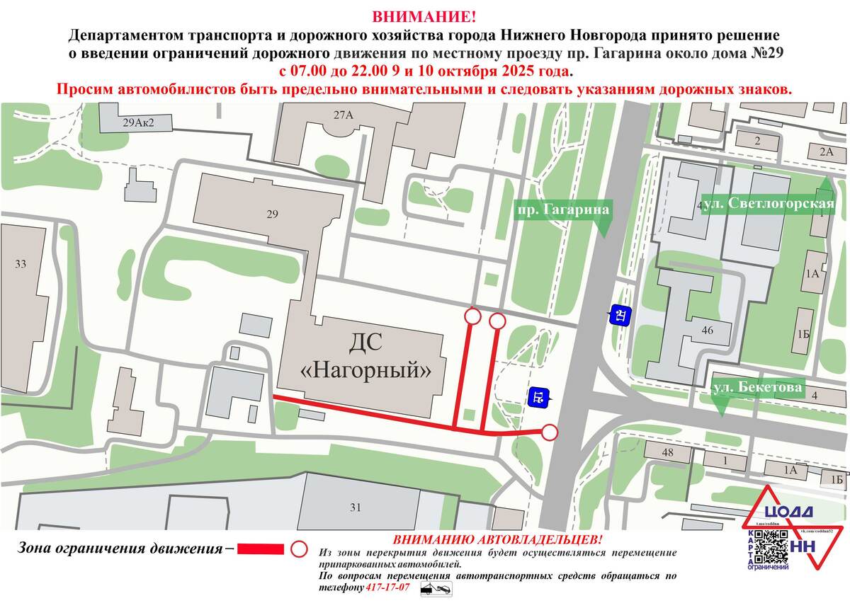В Нижнем Новгороде 9 и 10 октября 2025 года будет временно ограничено движение транспорта по местному проезду проспекта Гагарина в районе дома № 29. Об этом сообщили в администрации города.