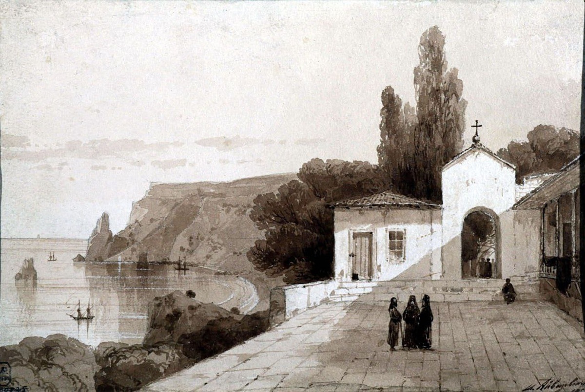 Айвазовский Иван Константинович, (1817–1900) Вид Георгиевского монастыря. 1858 год. Бумага, графит, сепия. 14 х 21 см Из фондов: Государственный Русский музей, Санкт-Петербург #живопись #искусство #графика #Айвазовский #Севастополь #Фиолент #архитектура