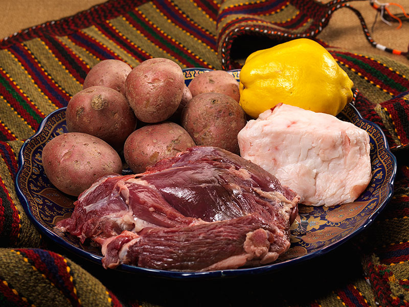 Казан на огне, на живом огне. Внизу казана картошка, потом мясной слой, а следом еще один слой - из картошки, айвы, моркови и чеснока. Казан наполнять только наполовину, имейте в виду! А сверху казана поставьте сковороду, а на нее положите немного тлеющих углей. Приготовится значительно быстрее!