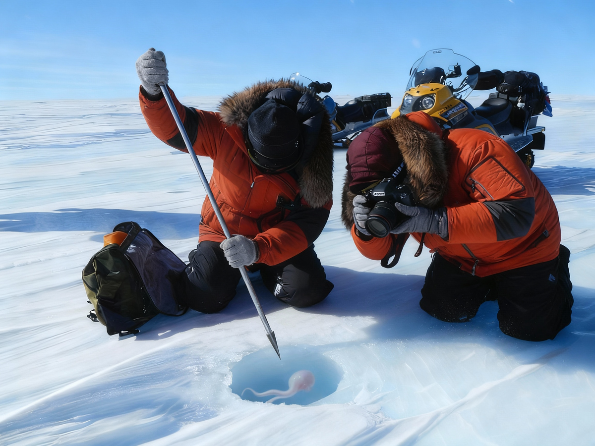 В начале 2015 года в Антарктиде произошло необычное событие, связанное с российскими полярниками. Событие хоть и похоже на фантастический сюжет, как и всё подобное этому случаю, но тем не менее стоит рассказать об этом. Двое мужчин, имена которых мы не будем разглашать, как всегда, объезжали на снегоходах заданный квадрат. Для чего они делают это каждый раз в хорошую погоду, нам не понять, да и не столь важно. В итоге одного из полярников привлекло странное место, вернее, образование на снегу. После чего полярник махнул напарнику в сторону, где находилось подозрительное место. Они остановились около него и начали разглядывать. Это была небольшая кучка кристаллизированного снега. Складывалось впечатление, как будто из-под низу выходит тепло. В итоге снег очистили, и оба мужчины были в недоумении от увиденного. Полярники увидели среди льда небольшую прозрачную лунку, в которой под толщей необычного прозрачного льда находилось нечто маленькое и с щупальцами, похожее на кальмара. Вскоре па