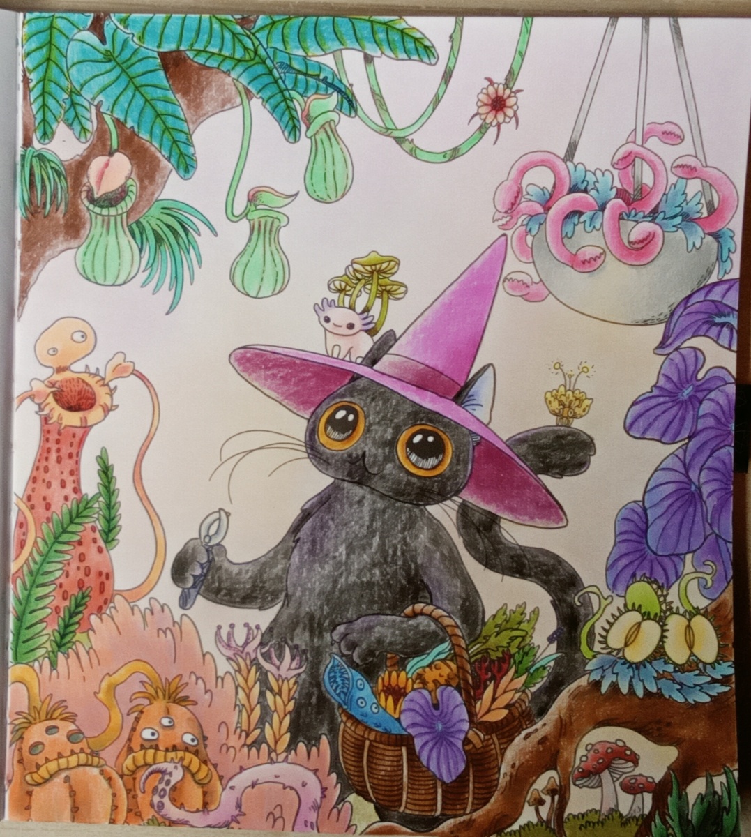 Всем чернично-космический привет! Раскрасила эти иллюстрации уже давно, но хочу показать их сегодня. Первая картинка - с мистическим котом по имени Далила, прогуливающимся в оранжерее ведьмы, полной странных и волшебных растений, которых нигде больше не найти. Некоторые из них давно исчезли, другие и вовсе никогда не существовали за пределами теплицы, ведь их создали при помощи заклинаний. Заметьте, что кот собирает цветы в корзинку. На второй картинке эта корзинка уже изображена более крупно. Можно рассмотреть растения, которые Далила срезал для своих зелий в своём жутком волшебном саду, более подробно. Вот такая парочка довольно ярких и мистических картинок получилась. Так как раскрашиваю здесь по порядку, то следующая иллюстрация будет с озером и необычными рыбами: мимо него идёт котик из теплицы к себе домой. Спасибо за просмотр! Всем вдохновения!