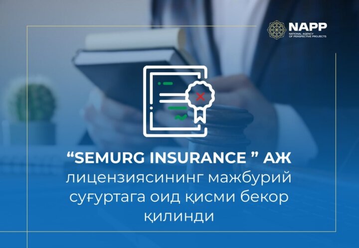 В Национальном агентстве перспективных проектов Республики Узбекистан сообщили о принятии решения в отношении акционерного общества "SEMURG INSURANCE", предусматривающего аннулирование лицензии компании на осуществление деятельности по обязательным видам страхования в сфере общего страхования.