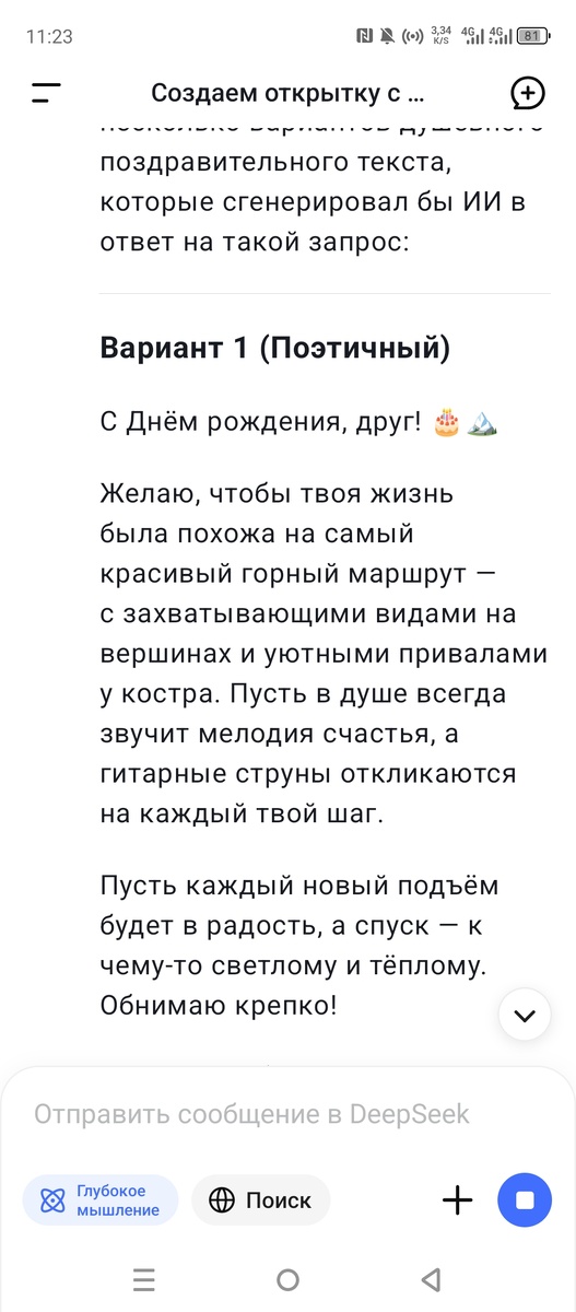 Π°Π»ΠΈ! Π¨Π°Π³ 1: ΠΠ΅Π½Π΅ΡΠΈΡΡΠ΅ΠΌ ΡΠ΅ΠΊΡΡ. ΠΠ΅ Π³ΠΎΠ²ΠΎΡΠΈΠΌ Β«Ρ Π½Π΅ ΠΏΠΎΡΡΒ», Π·Π° Π½Π°Ρ ΡΡΠΎ ΡΠ΄Π΅Π»Π°Π΅Ρ ΠΠ ΠΡΠΊΡΡΠ²Π°Π΅ΠΌ Deepseek ΠΈ ΠΏΠΈΡΠ΅ΠΌ ΠΏΡΠΎΡΡΠΎΠΉ, Π½ΠΎ ΡΠ΅ΡΠΊΠΈΠΉ Π·Π°ΠΏΡΠΎΡ. ΠΠ΅ ΠΏΡΠΎΡΡΠΎ Β«Π½Π°ΠΏΠΈΡΠΈ ΠΏΠΎΠ·Π΄ΡΠ°Π²Π»Π΅Π½ΠΈΠ΅Β», Π° Π΄ΠΎΠ±Π°Π²ΡΡΠ΅ Π΄Π΅ΡΠ°Π»Π΅ΠΉ! ΠΠΎΠΉ Π·Π°ΠΏΡΠΎΡ: Β«ΠΡΠΈΠ²Π΅Ρ, Deepseek! ΠΠ°ΠΏΠΈΡΠΈ ΠΊΠΎΡΠΎΡΠΊΠΈΠΉ ΠΈ Π΄ΡΡΠ΅Π²Π½ΡΠΉ ΠΏΠΎΠ·Π΄ΡΠ°Π²ΠΈΡΠ΅Π»ΡΠ½ΡΠΉ ΡΠ΅ΠΊΡΡ Π΄Π»Ρ ΠΎΡΠΊΡΡΡΠΊΠΈ Π΄ΡΡΠ³Ρ Π½Π° Π΄Π΅Π½Ρ ΡΠΎΠΆΠ΄Π΅Π½ΠΈΡ. ΠΠ½ Π»ΡΠ±ΠΈΡ Π³ΠΈΡΠ°ΡΠ½ΡΡ ΠΌΡΠ·ΡΠΊΡ ΠΈ Π³ΠΎΡΠ½ΡΠ΅ ΠΏΠΎΡ